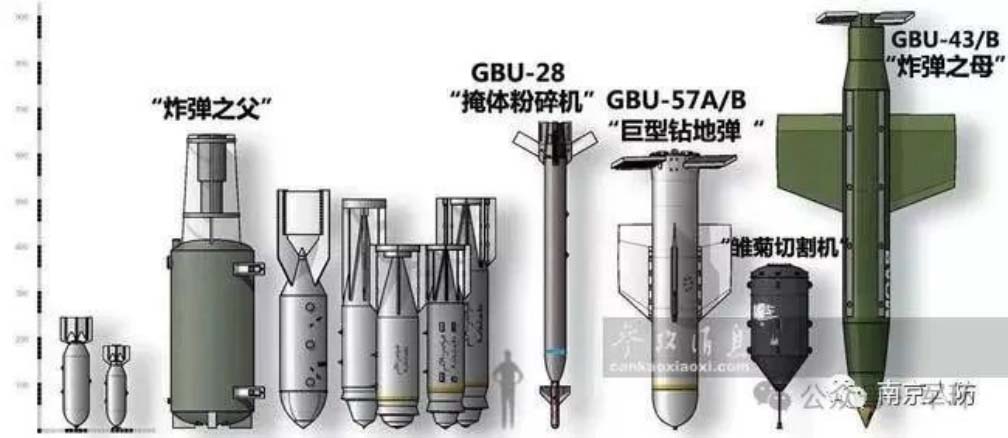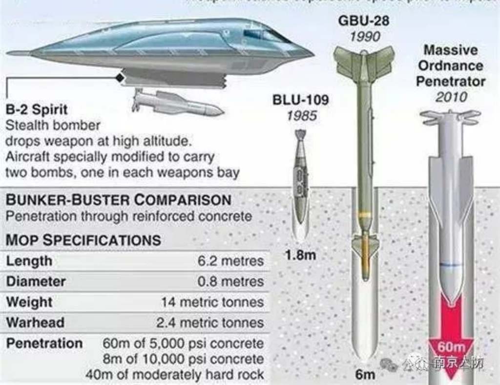 ▲MOP全重14噸,是美軍現(xiàn)役最重常規(guī)航彈,遠(yuǎn)超8.5噸級(jí)的GBU-43B“炸彈之母”(MOAB)燃料空氣炸彈,同時(shí)還是美軍現(xiàn)役武庫(kù)中鉆地能力最強(qiáng)的非核炸彈。